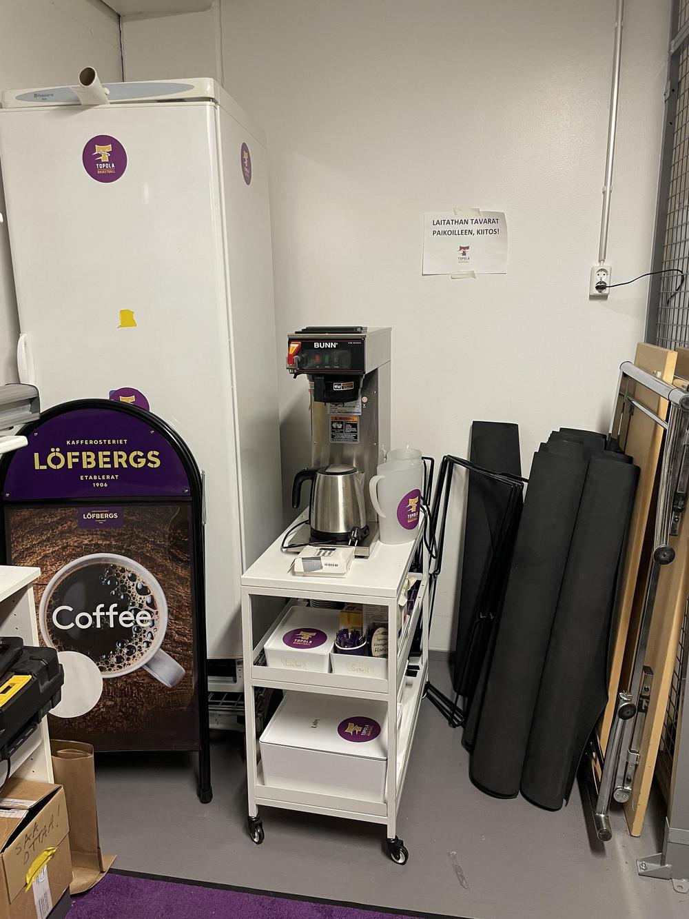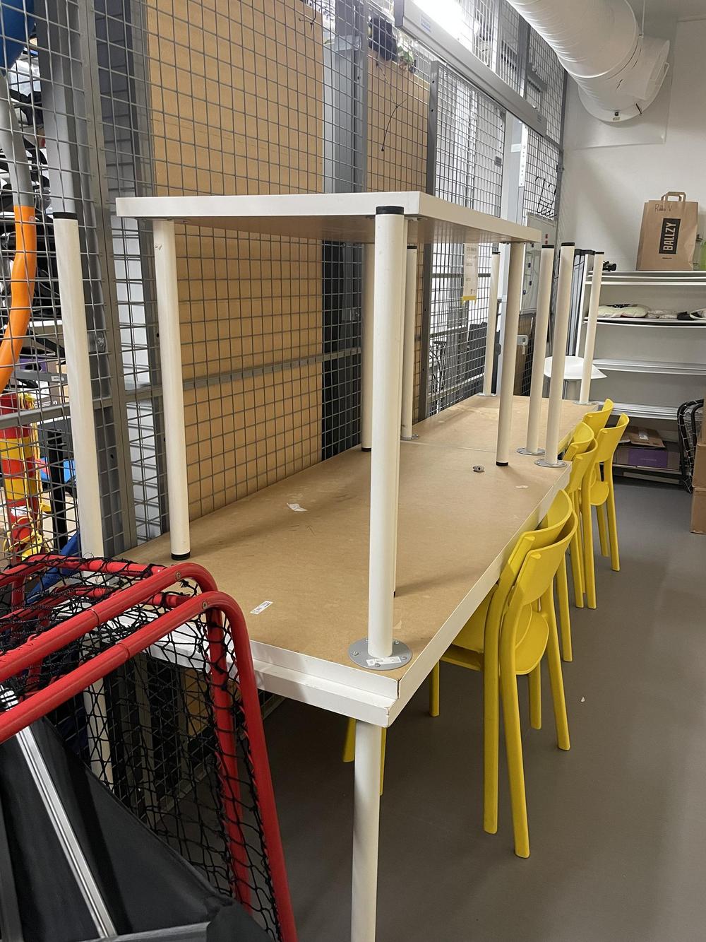 - Valkoiset toimitsija- ja buffapöydät löytyvät samasta paikasta kuin keltaiset tuolit. Toimitsijapöydät ovat pienemmät valkoiset ja buffapöydät isommat valkoiset.